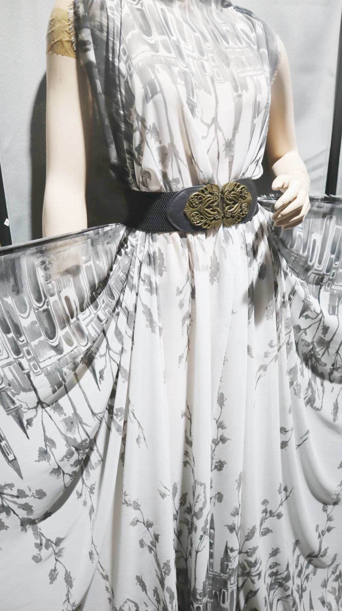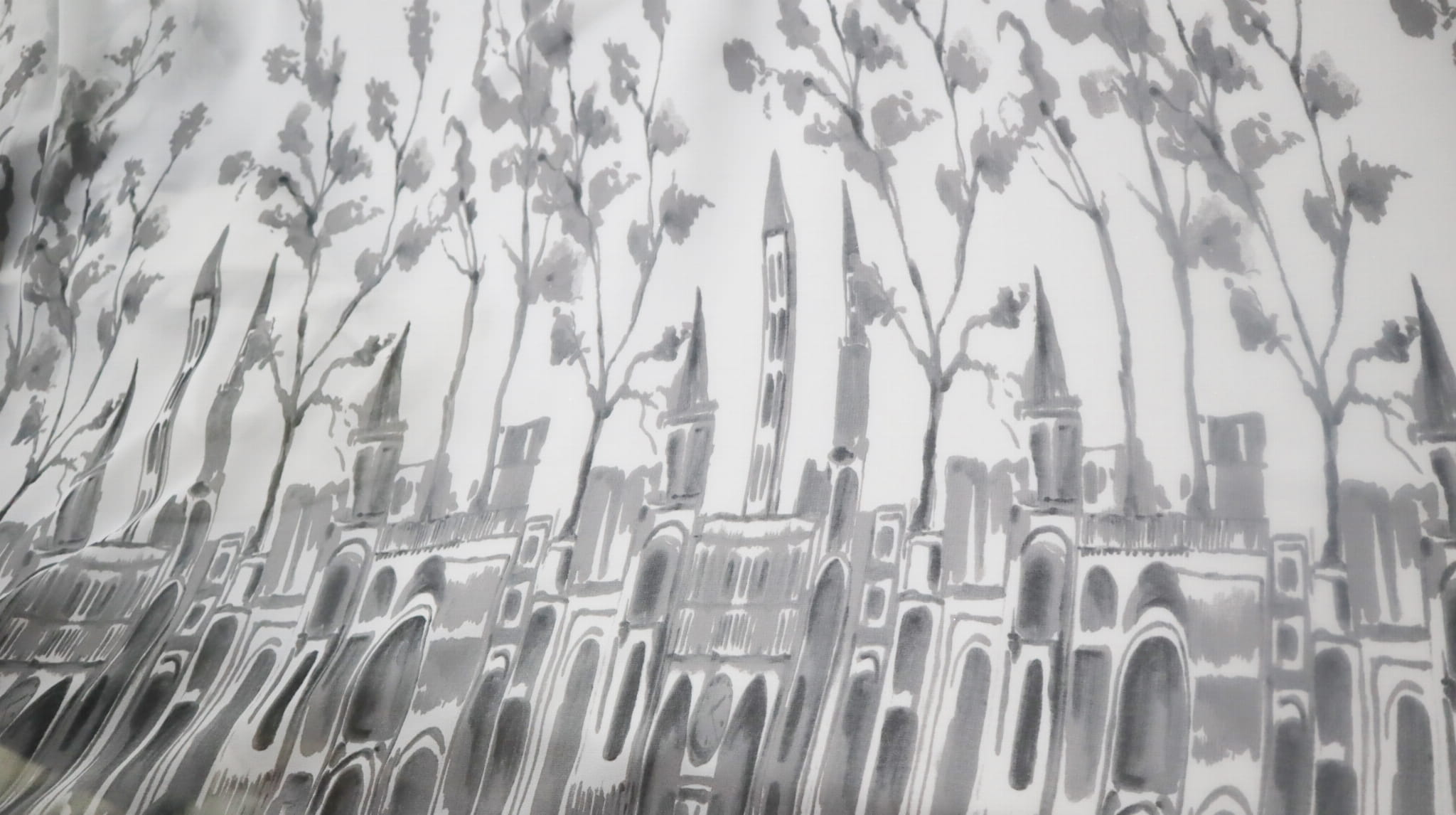Tenký poloprůhledný šifon - lem barva bílá a vzor - světle šedá