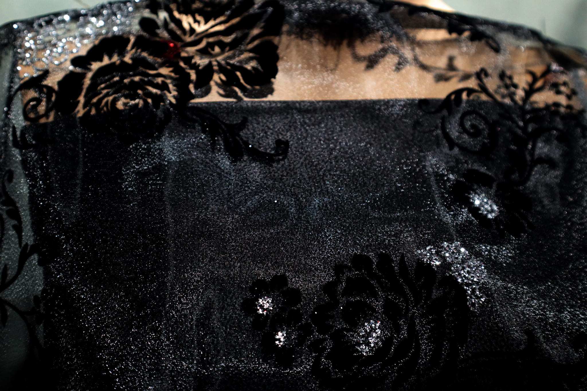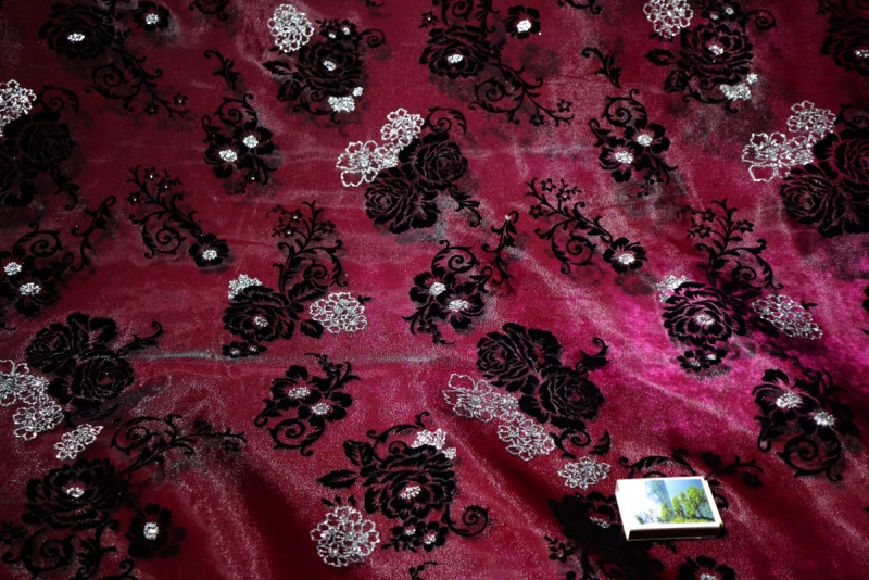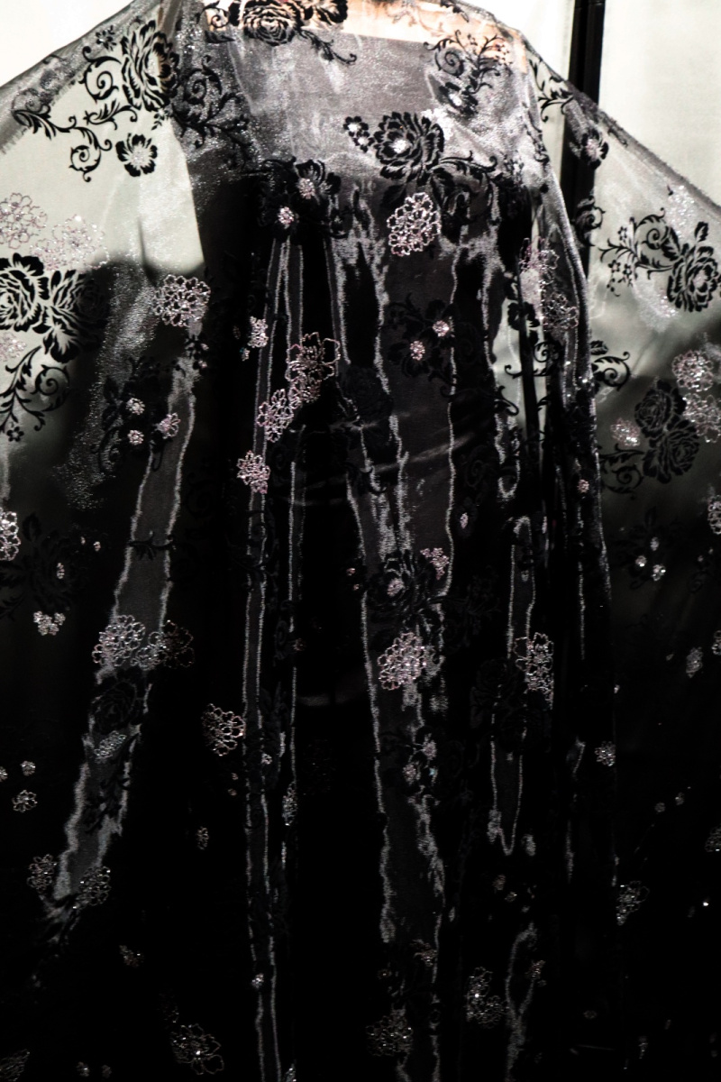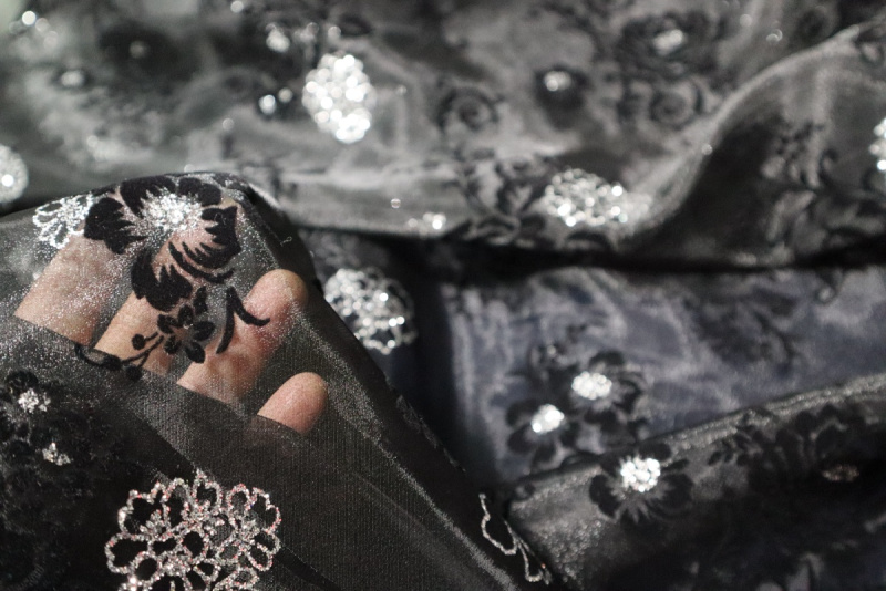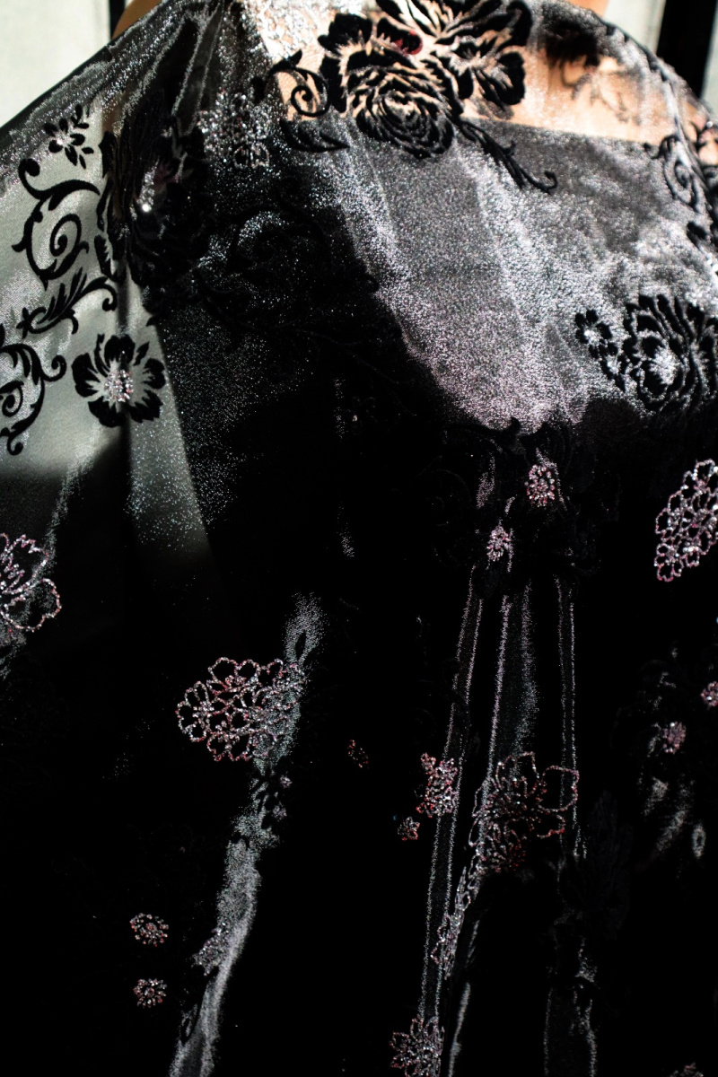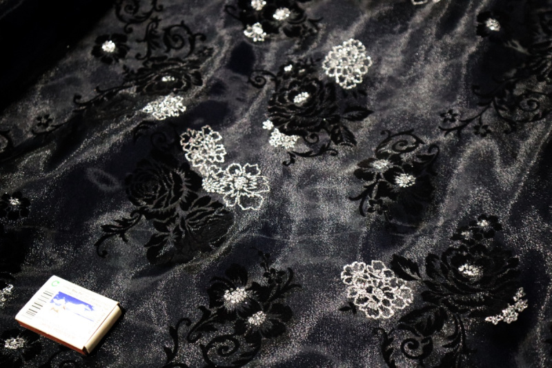 kwiatkowy wzor - czarny flok i srebrny klejony brorat